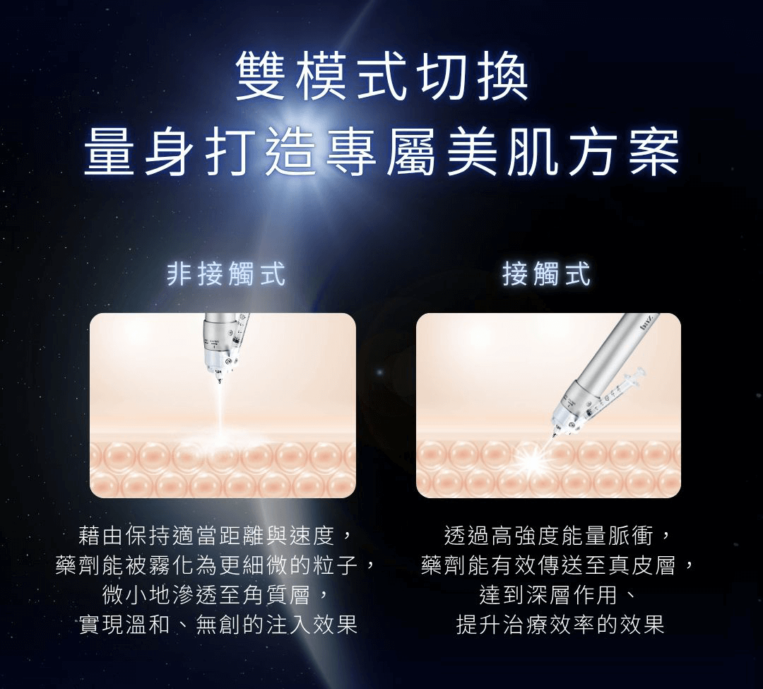 而接觸式模式則運用精密脈衝推進技術,控制輸出節奏與深度,使注入過程更加集中且穩定。由於出口細小,對表層組織的影響較低,可能會感受到些微痛感,但整體舒適度仍普遍高於傳統針具施作方式。